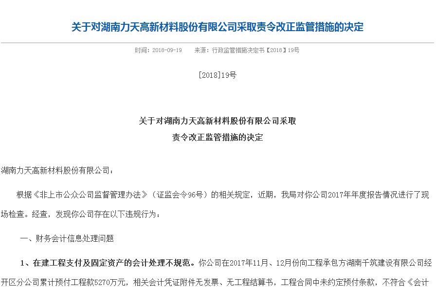 9月19日,湖南證監局在官網(wǎng)發(fā)布了《關(guān)于對湖南力天高新材料股份有限公司采取責令改正監管措施的決定》,對存在問(wèn)題進(jìn)行了詳細描述。
