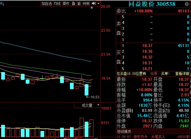 昨日,滬深大盤(pán)齊跌超5%,創(chuàng )下兩年半以來(lái)最大跌幅。今日午時(shí)收盤(pán),上證指數下跌0.12%,深證成指下跌0.32%,同益股份逆勢漲停。截至午時(shí)收盤(pán),同益股份報收于18.37元/股,暫收一字板漲停,封單4.5萬(wàn)手。