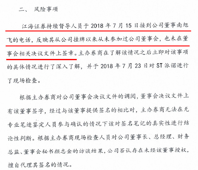 另外,今年7月15日,江海證券持續督導人員接到ST派諾董事南旭飛的電話(huà),反映其從公司掛牌以來(lái)從未參加過(guò)公司董事會(huì ),也未在董事會(huì )相關(guān)決議文件上簽字。