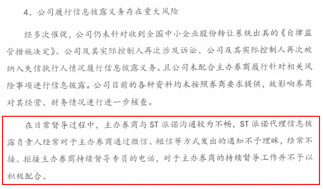 除了不給錢(qián),ST派諾對于主辦券商的持續督導工作配合也不積極,短信、微信不理不睬,還經(jīng)常拒接主辦券商的電話(huà)……